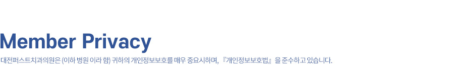 대전퍼스트치과은 (이하 병원 이라 함) 귀하의 개인정보보호를 매우 중요시하며, 『개인정보보호법』을 준수하고 있습니다.